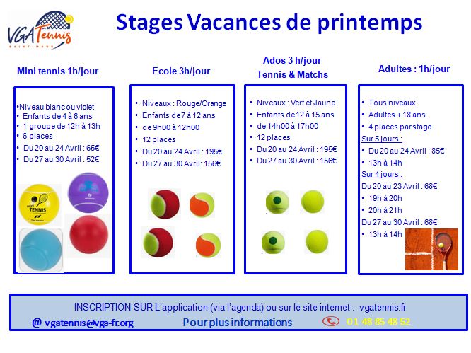 La VGA Tennis organise des stages pour les enfants durant les deux semaines de chaque petites vacances scolaires ainsi que durant les 2 premières semaine de juillet.