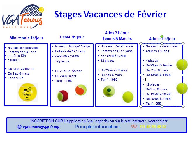 Pour plus d’informations, merci de contacter le secrétariat : vgatennis@vga-fr.org ou 01 48 85 48 52